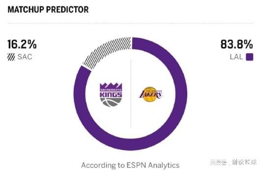 如今湖人终于有福利局,那就是继续在主场,对阵西部倒数第二的国王。而ESPN在比赛开始前,按照惯例进行了预测,湖人拥有压倒性优势,战鱼腩被预测胜率超8成,看来只要自己别太轻敌,获胜应该不成问题。