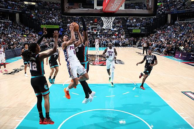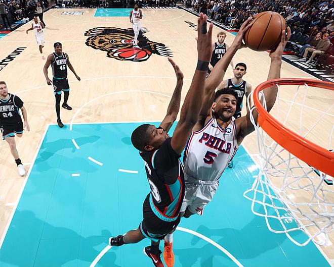 本场比赛中,76人的替补后场大将昆汀-格莱姆斯(Quentin Grimes)的表现还是非常出色的。格莱姆斯全场出场37分31秒,投篮9中4,三分线外6中2,罚球2中1,得到了11分3篮板3助攻3抢断的数据,没有失误和犯规,正负值更是达到了全场最高的+18。格莱姆斯在进攻端受制于球权没有办法为球队提供更多的支持,但是他也还是得到了一些分数的,而且他也能够在一定程度上起到分享球方面的作用。最关键的是,格莱姆斯在防守端的表现确实是相当突出,他确实是能够在防守端起到关键的作用。格莱姆斯防守贾-莫兰特(Ja Morant)的效果相当不错,格莱姆斯一下去,莫兰特就能随便乱杀了。以莫兰特的状态,如果没有格莱姆斯,他应该是能打出50+的数据的。+18的正负值也能够说明一点,格莱姆斯在场上对于比赛的影响力非常惊人。