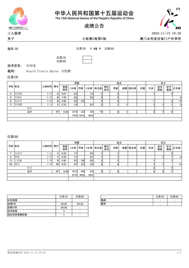 今天,身处被动的江苏队和江西队一战更是惨烈,双方从开局一直纠缠到结束,更多时候都是以肉搏战交锋,双方最后一刻战至17平,此时江苏队对于裁判判罚不满,场上球员被裁判一一罚出场,于是出现了全队夺权的场面,实属罕见,最终江西队三连胜以小组头名出线。