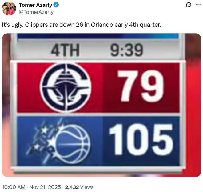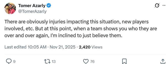 随后绝望的Tomer Azarly继续发文道:“显然伤病问题影响到了快船队,还有新援低迷的因素,但到了这个时候,他们一次又一次展现出他们的真面目时,我认为他们也就这样了。”