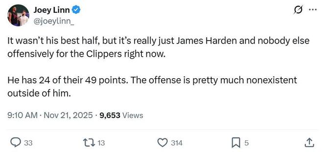 其中随队记者Joey Linn坦言:“目前快船队进攻端除了哈登之外,没有任何人站出来,全队半场49分他独揽24分,每当哈登一下场,进攻就陷入停滞。”