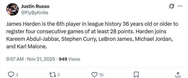 凭借这样的表现,哈登已经连续4场交出至少28分表现,成为NBA历史上第6位在36岁后还能完成这一壮举的球员,此前5人分别是贾巴尔、库里、詹姆斯、乔丹和卡尔马龙。