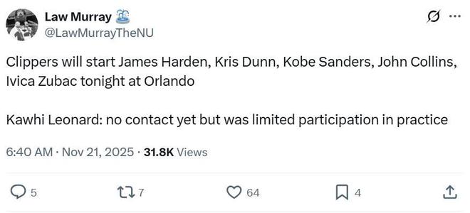无奈的是,哈登身旁没有任何帮手,大当家小卡因伤连续缺席第9场比赛,并且根据快船队记Law Murray报道,小卡尚未参与对抗性训练,依旧没有明确的回归时间表。