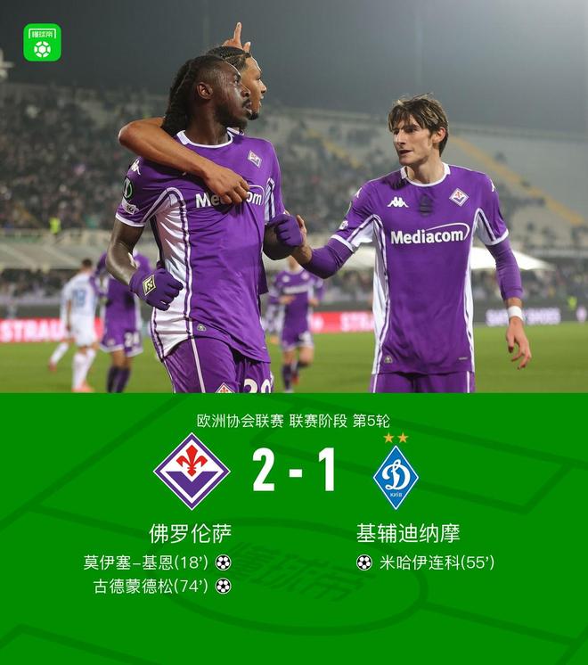 北京时间12月12日,欧洲协会联赛联赛阶段第5轮展开较量,佛罗伦萨迎战基辅迪纳摩。比赛中,多多送出助攻,莫伊塞-基恩接球后完成破门,为球队取得领先。随后,皮哈洛诺克助攻米哈伊连科推射得手,将比分扳平。比赛进入尾声阶段,古德蒙德松挺身而出,攻入关键一球,帮助球队再度建立优势。最终全场比分为2-1,佛罗伦萨战胜基辅迪纳摩。