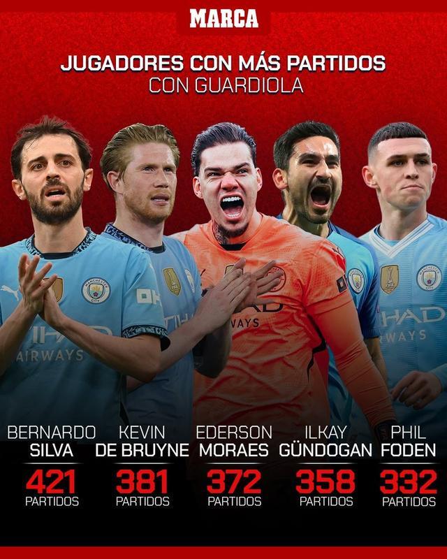 瓜帅麾下球员出场榜:B席421场居首,德布劳内381场次席