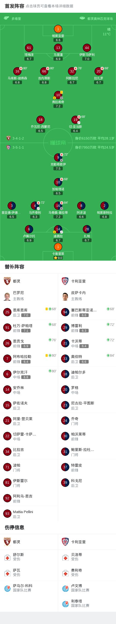 卡利亚里2-1逆转都灵,克勒奇索伊、马泰奥-普拉蒂破门