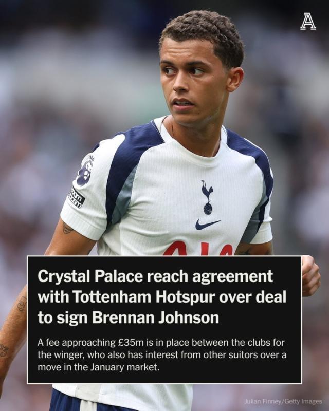 12月30日讯 据The Athletic名记奥恩斯坦报道,水晶宫已经与热刺达成协议,以近3500万镑转会费签布伦南·约翰逊。球员仍需在交易最终确定前决定自己的未来,双方协商的转会费接近3500万镑(折合欧元约4000万欧)。目前,约翰逊也吸引了其他球队在一月转会窗的兴趣。2023年夏窗,布伦南·约翰逊以5500万欧转会费从诺丁汉森林加盟热刺,本赛季球员为热刺出战22场比赛,打进4球,德转身价3500万欧。