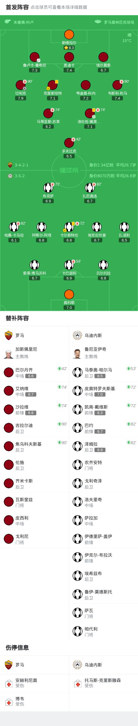 第42分钟,卡马拉手球送点,佩莱格里尼主罚点球命中,罗马1-0